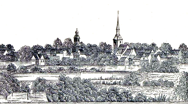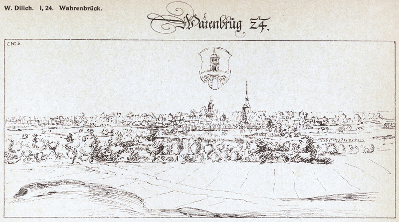 Die Wahrenbrücker haben das Glück den Schatz der urkundlichen Quellen zu ihrer Geschichte noch zu heben, nicht wie manche versunkenen Ortschaften enthalten die Sammlungen der Landesurkunden den Stoff zu einer Urkundensammlung zur Wahrenbrücker Geschichte. Weit zerstreut und verändert sind viele Dokumente, die zum Wahrenbrücker Urkundenwerk zu vereinigen sind, in den Archiven Sachsens, Meißens, der Lausitz und der Mark Brandenburg. Alte Nachrichten vom Ort sind schon vorhanden, meistens wiederholten sich diese wie in den Kreysigschen Beiträge oder den Ludewigschen Reliquiae, aber sie bilden immer wieder den Grundstock kommender Publikationen. Mit den Hinweisen das der oder die Historiker es oft nicht so genau nahmen mit ihrer angeblichen vor Ort Recherche, übernahmen sie doch oft deren Nachrichten. So kam es vor, dass zum Beispiel Wahrenbrück schon ab 1199 in alten Schriften als Wardenbrucke bekannt war, in verschiedensten Interpretationen aber, wie in Landkarten von 1585 als Arenbrück auftaucht. Gerhard Mercator oder Gerard de Kremer in deutschem Gerhard Krämer der als erster winkeltreue Projektionen in Landkarten zeichnete übernahm es wohl von Laurentius Beckenstein, der der Meinung war, dass man Wahrenbrück so nennen sollte. Und so stand dann dieser falsche Name in verschiedenen alten Landkarten, den man diesen bedeutenden Männern in jener Zeit auch abnahm. Ja, Beckenstein brachte es sogar fertig in seinem Bericht zu Liebenwerda die Wahrenbrücker so zu beeinflussen dass sie noch heute behaupten Karl der Großen hätte hier 796 eine Festung gegen die Wenden gebaut. Das wäre eine echte Sensation und schon wieder eine eigene Geschichte wert. Was Wahrenbrück anlangt hat die schweren Schicksale der Säkularisation, des Schmalkaldischen Krieges und mehrere Feuersbrünste ihren kostbaren Schatz der Stadturkunden erheblichen Schaden zugefügt bzw. sie vernichtet. Ein unersetzlicher schwerwiegenden Verlust zur Geschichte von Wahrenbrück und so müssen wir uns, um diese zu ersetzen an vorhandene Bruchstücke und sind sie noch so klein halten. Die Fragen nach dem Standort des so oft genannten Schlosses, des Wehrturms oder der Warte, der Werdegang beider Mühlen oder der der Stadt dem Namen gegebenen Brücke bewegt doch noch so Einige. Wenn diese auch immer mehr schwinden so wollen wir etwas Licht in diese Schattenwelt bringen, ehe sie für uns ganz verschwindet. Umso bedeutender ist das Vorhandensein von alten Zeichnungen und Landkarten, wie die oft zu sehenden Stadtansichten von Liebenwerda, Wahrenbrück, Mühlberg, Uebigau sowie Stadt Strehla und hier kann man lesen „nach Dilich“. Wenn man diese Zeichnungen sieht kommt man sofort zu dem Schluss, dass hier etwas nicht stimmt. Auf einer langen Suche nach dem Urheber jener Zeichnungen die uns vorliegen kam ich dann schließlich auf den Verlag Emil Baensch jun. in Magdeburg, dessen Besitzer zu der Zeit des Druckes 1877, schon ab 1867 Hermann Fries war. George Adalbert von Mülverstedt1), hat in seinem Werk „Diplomatarium Ileburgense“2) das Wappen von Wardenbrucge um 1500 und diese Nachzeichnung der Stadtansicht von Wahrenbrück veröffentlicht. In diesem Zeitraum um 1877 entstand wahrscheinlich diese Nachzeichnung von Wahrenbrück in der wesentliche Merkmale des Ortes weggelassen wurden. Wilhelm Dilich von 1571 bis 1650, war ein deutscher Baumeister, Ingenieur, Holzschneider, Kupferstecher, Zeichner, Topograph in seinen Federzeichnungen kursächsischer Ortschaften aus den Jahren 1626-1629 soll er unsere Gegend bereist haben. Die wirtschaftliche Bedeutung von Wahrenbrück war in dem Entstehungsjahr des Bildes wahrscheinlich schon so gering, sodass er nicht einmal die mit Zahlen gekennzeichneten Gebäude beschriftete.