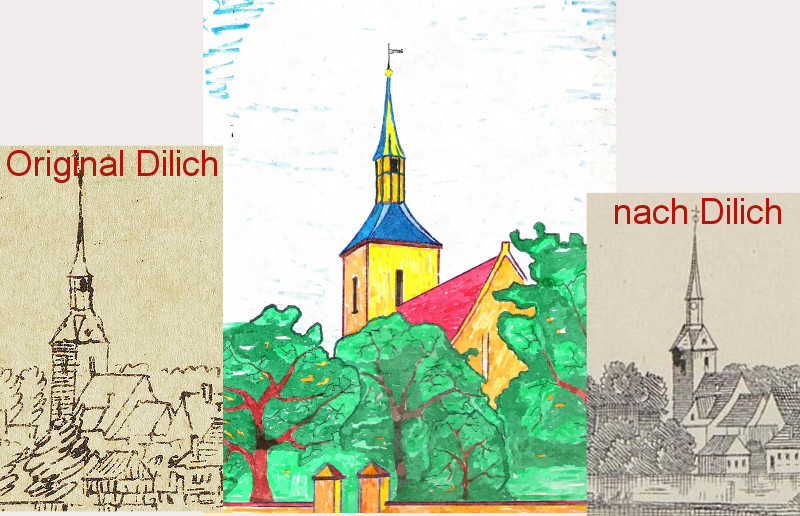 Dass der Kirchenturm „der Zeigefinger Gottes“ als repräsentatives Symbol von Macht und Größe kritisch wahrgenommen wird, zeigt sich darin, dass die auf Demut und Bescheidenheit zielenden Orden der Zisterzienser, ein Verbot von Kirchtürmen für ihre Klöster und Kirchen erließen. Erst in der Zeit der Romanik, in Sachsen etwa 2. Hälfte 11. bis Mitte 13. Jahrhundert wurden im Kirch Bau, Türme dazu gebaut. In dieser Zeit war unser Kirchturm wahrscheinlich ohne diese hohe Laterne gebaut wurden. Ende des 13. Jahrhunderts begannen sich die Zisterzienser von ihren Gründungsidealen zu entfernen. Da unsere Pfarrkirche dem Patronatsrecht der Zisterzienser bis zur Reformation unterlag ist es wahrscheinlich dass der Turm mit der hohen Laterne erst um 1300 entstand. Bei der Nachzeichnung ist der Kirchturm mit einer Uhr und einem falschen Dachstuhl gezeichnet wurden. Die Uhr gab es nicht sie war wie man unten sehen kann im Rathaus. Die Kirche brannte 1714 ab und wurde teilweise neu aufgebaut, seit 1710 befand sich hier eine Kantorschule mit einem Oberpfarrer und einem Diakonus.