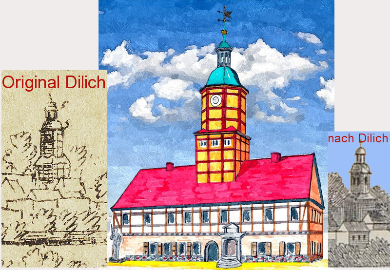 Dass der Kirchenturm „der Zeigefinger Gottes“ als repräsentatives Symbol von Macht und Größe kritisch wahrgenommen wird, zeigt sich darin, dass die auf Demut und Bescheidenheit zielenden Orden der Zisterzienser, ein Verbot von Kirchtürmen für ihre Klöster und Kirchen erließen. Erst in der Zeit der Romanik, in Sachsen etwa 2. Hälfte 11. bis Mitte 13. Jahrhundert wurden im Kirch Bau, Türme dazu gebaut. In dieser Zeit war unser Kirchturm wahrscheinlich ohne diese hohe Laterne gebaut wurden. Ende des 13. Jahrhunderts begannen sich die Zisterzienser von ihren Gründungsidealen zu entfernen. Da unsere Pfarrkirche dem Patronatsrecht der Zisterzienser bis zur Reformation unterlag ist es wahrscheinlich dass der Turm mit der hohen Laterne erst um 1300 entstand. Bei der Nachzeichnung ist der Kirchturm mit einer Uhr und einem falschen Dachstuhl gezeichnet wurden. Die Uhr gab es nicht sie war wie man unten sehen kann im Rathaus. Die Kirche brannte 1714 ab und wurde teilweise neu aufgebaut, seit 1710 befand sich hier eine Kantorschule mit einem Oberpfarrer und einem Diakonus.