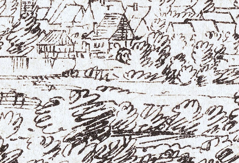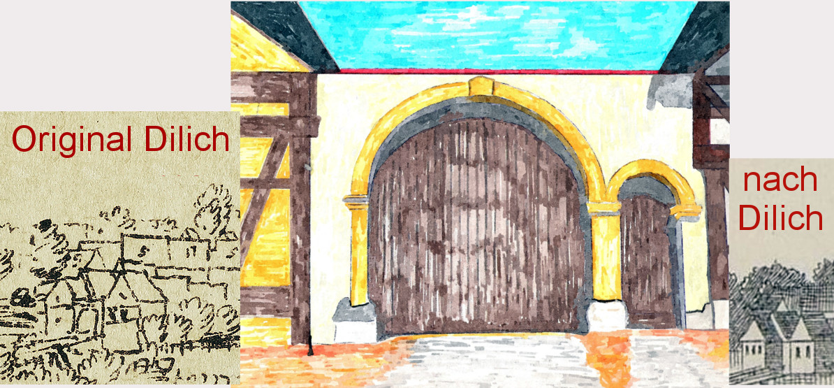 Dieses Teilstück der Nachzeichnung enthält kein Stadttor, in der Originalzeichnung kann man es deutlich erkennen. Es könnte so ausgesehen haben wie auf dem Bild in der Mitte wenn auch ohne Tür und vielleicht als Fachwerkbau. Wenn man sich das Stadtwappen der Stadt genau ansieht kann man hier noch auf einen anderen Gedanken kommen. Dieses enthält eine Kette die zu einer Wippbrücke (Zugbrücke) passt und die Untersuchung des Geländeteils mit viel Wasser vor der Renaturierung, lässt die Vermutung aufkommen, dass sich genau an der Stelle des Stadttores Früher diese Wippbrücke befand.